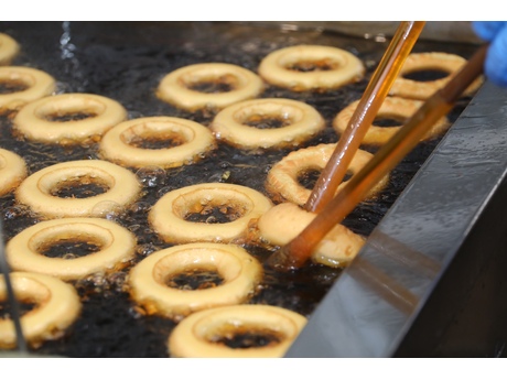 ②フライ作業 : ミキシングした生地をカッティングマシンでカッティングして、ドーナツをフライヤーでフライ(油で揚げ)します!